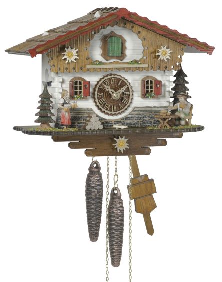dettagli:il taglialegna lavora al rintocco del cucù , mentre i ballerini danzano al suono del carillon e si muove la ruota del mulino.
